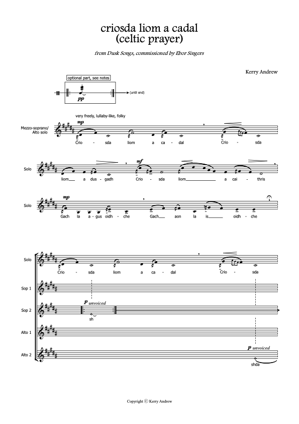 Criosda Liom a Cadal (Celtic Prayer), SSAA with mezzo-soprano/alto solo and optional percussion, by Kerry Andrew