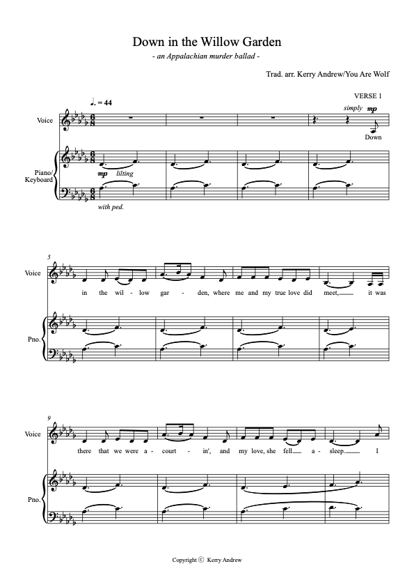 Down in the Willow Garden by Kerry Andrew: a song for upper voice and keyboard instrument.